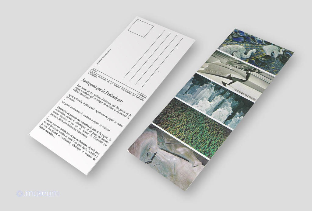 Open the document Leaflet from the Finnish section of the Scandinavian Pavilion at Expo 67. It presents Finland as a world leader in exporting paper, board, and machinery for the paper industry, as well as in architecture, textile design, functional furniture, ceramics, and glassware.