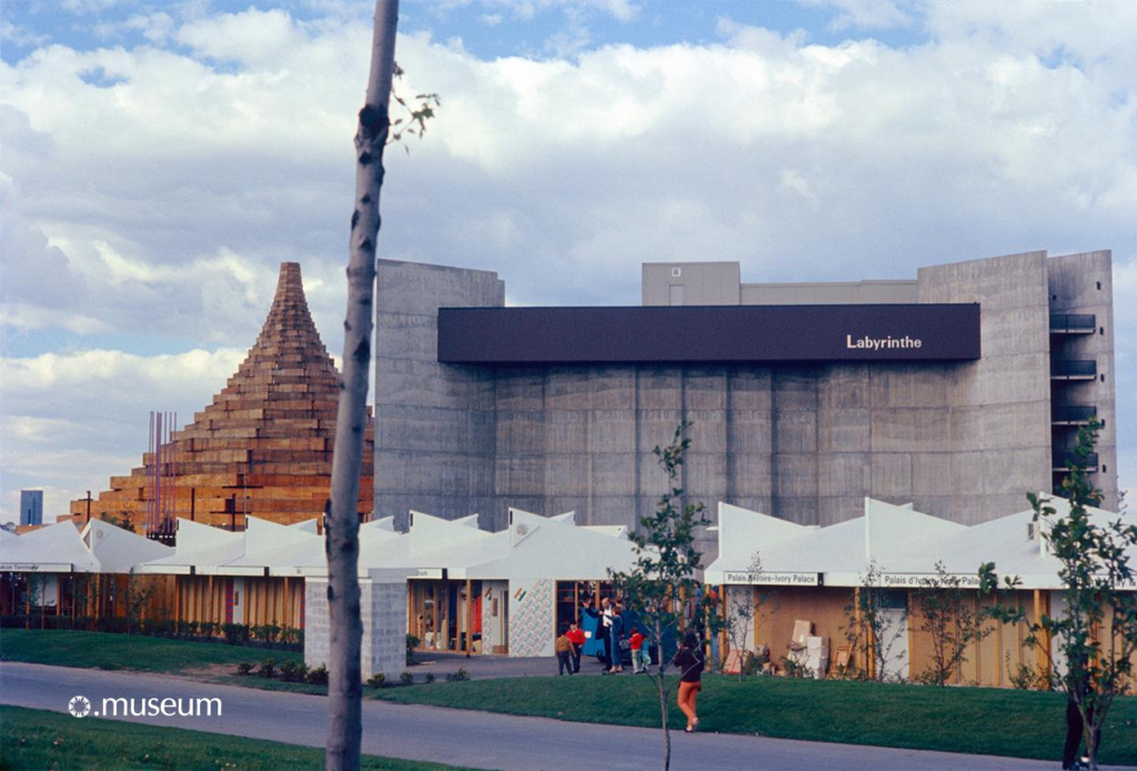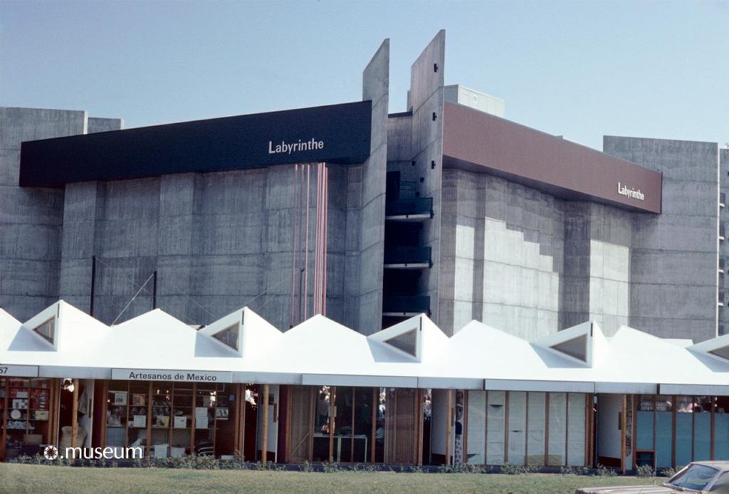 View of the pavilion and the adjoining shops, with the “Man in the Community” pavilion in the background. The Labyrinth Pavilion at Expo 67, designed by the National Film Board of Canada, was an immersive five-story cinematic installation. It featured three main rooms: the first projected images onto giant screens, the second was a corridor…