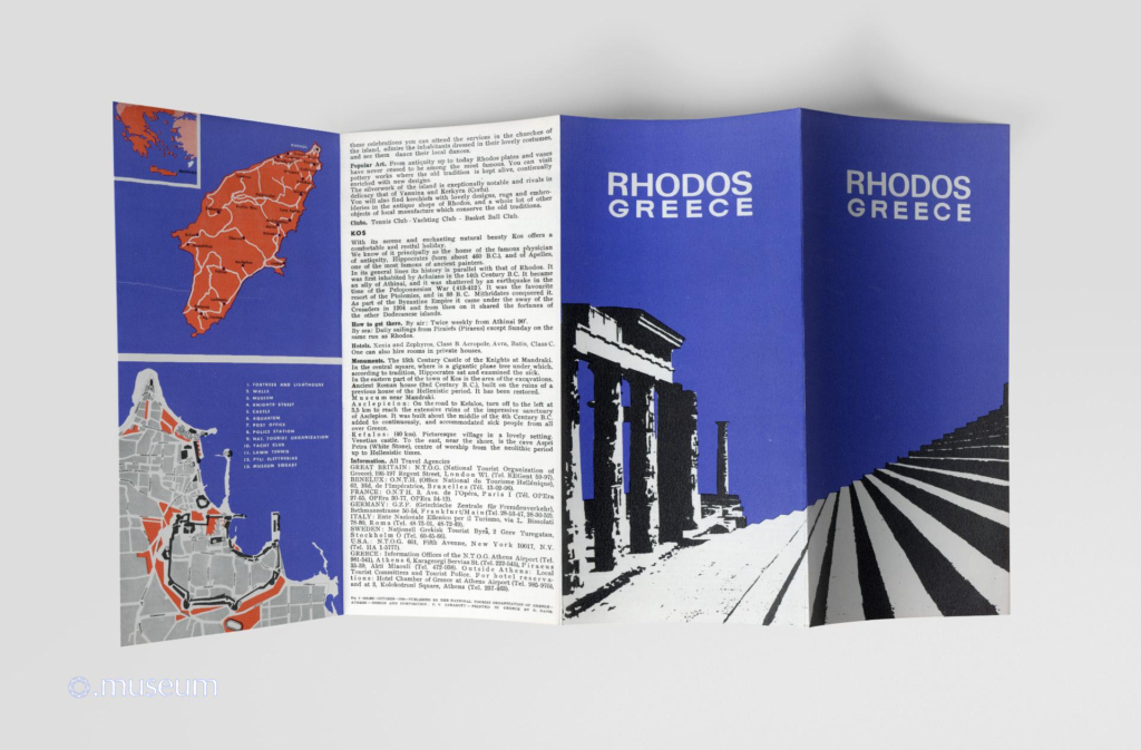Dépliant touristique sur l’île de Rhodes. « Son histoire fut marquée par sa position géographique. Rhodos (Rhodes) changea de mains à plusieurs reprises, en commençant par les Perses qui l’occupèrent au 6ème s. av. J.C. Mais toutes les adversités ne firent que renforcer l’instinct vital et la créativité de ses habitants. Rhodos est jalonnée de monuments et de statues datant époques classique et hellénistique. Qui d’ailleurs, n’a pas entendu parler du fameux « Colosse de Rhodes•, une des sept merveilles du monde, dont seule subsiste aujourd’hui la renommée ? À l’époque byzantine, sa puissance commerciale et navale atteint son point culminant et avec les Croisades, l’île placée sur le chemin de la Terre-Sainte, connait un nouvel essor dû aux Chevaliers de I’ Ordre de Saint-Jean et qui dura plus de 200 ans. En 1622, les Turcs leur succédèrent, puis ce furent les Italiens en 1912. En 1947, elle fut finalement rattachée à la Grèce. »