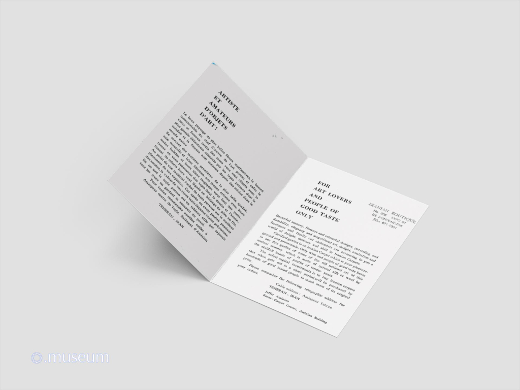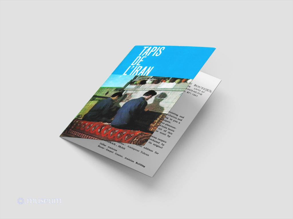 Dépliant dédié aux tapis persans, présenté lors de l’Exposition universelle et internationale de Montréal en 1967. Il met en avant la finesse, la durabilité et l’élégance des tapis iraniens, fabriqués à partir de soie naturelle et de laine Mérinos, et valorise leur caractère patrimonial et investissement durable.