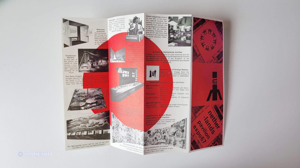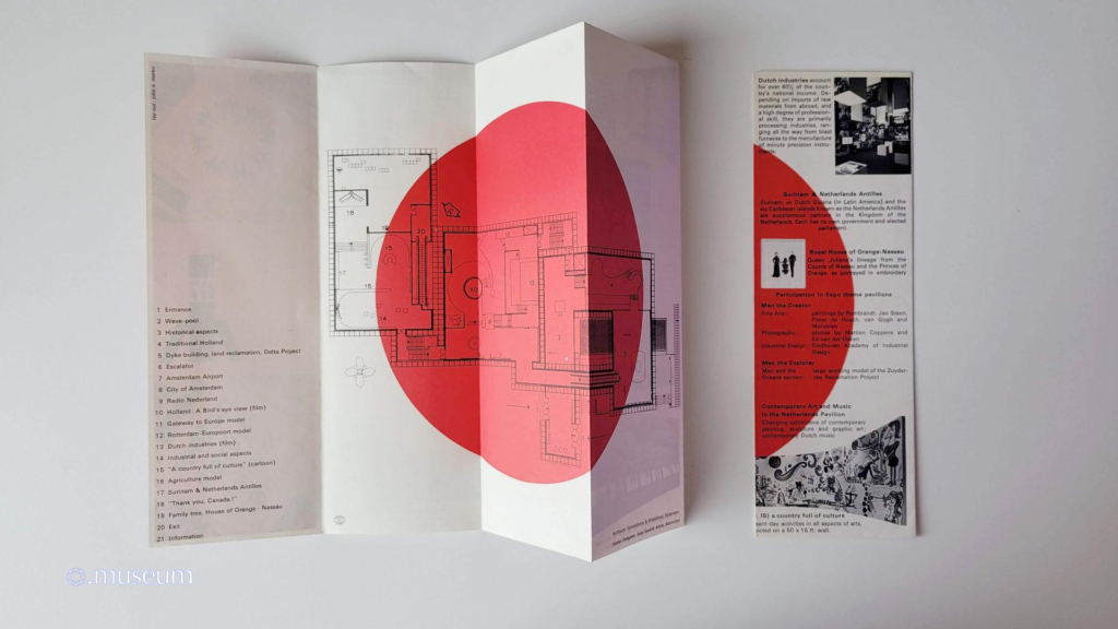 Description du pavillon néerlandais : Hollande traditionnelle, le projet Delta, A Haringvliet, Amsterdam, Porte de l’Europe, Rotterdam-Europoort, Industries hollandaises, le Surinam et les Antilles néerlandaises, la maison royale d’Orange-Nassau ainsi que les les Arts plastiques et musique des Pays-Bas.