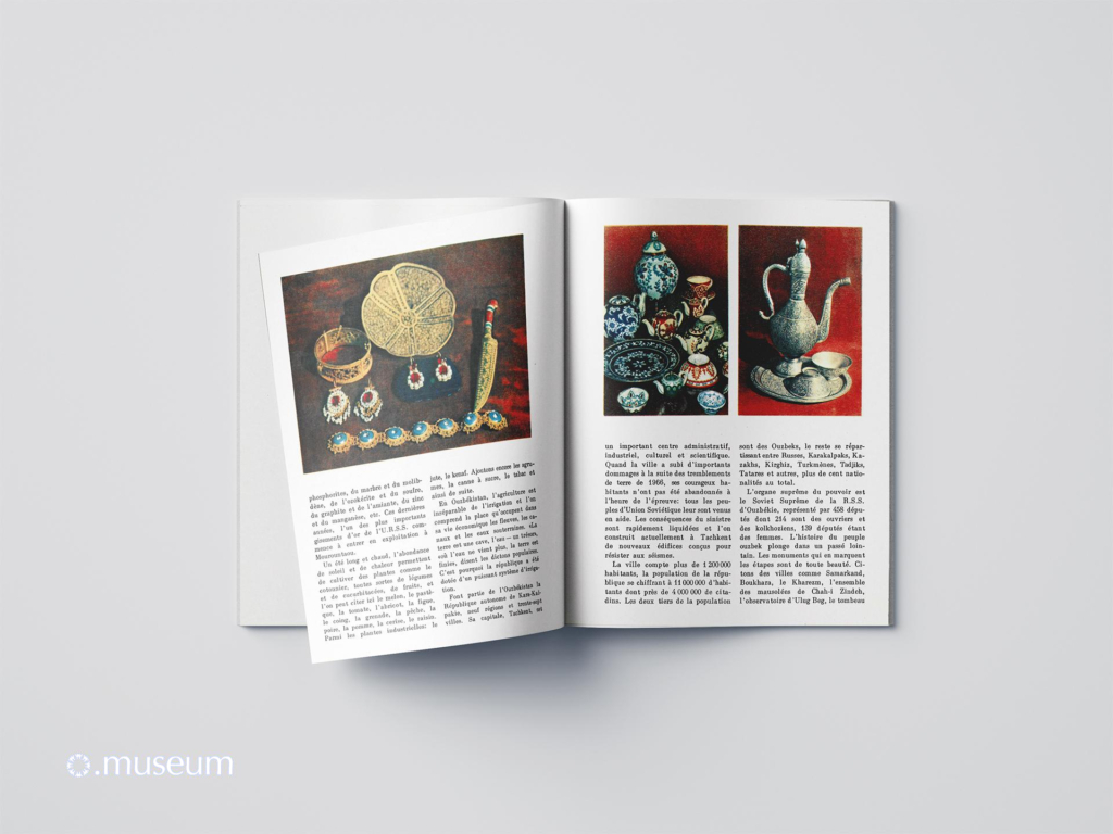 Livret informatif sur la République Socialiste Soviétique d’Ouzbékie. Fait partie d’une série de 15 livrets, publiés en français, anglais et russe, sur les Républiques Socialistes Soviétiques.