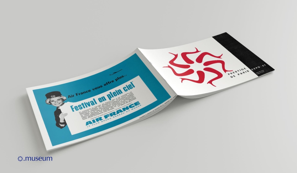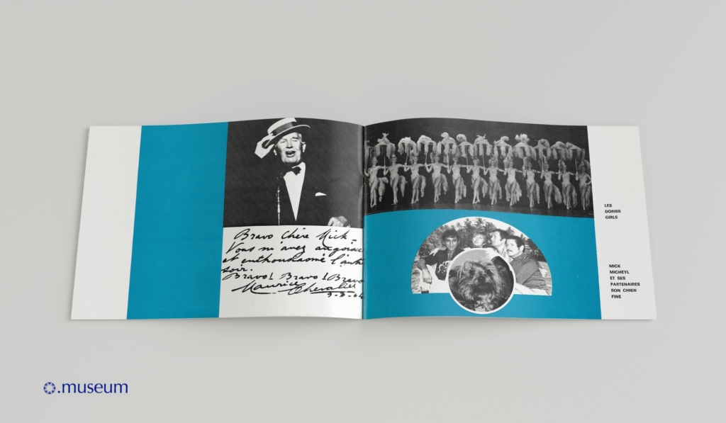 Program of the performance Prestige de Paris – Garden of the stars during the World Festival. The document contains the ticket for the October 12, 1967 performance pasted on one of the pages. The show includes a patchwork of French culture: variety shows with Mick Micheyl, cabaret cancan with the Doriss Girls from the Moulin Rouge (Jean-Pierre Charnas and Nicole Rovère), theater with Bernard Dhéran from the Comédie Française and opera with the star dancers Daniel Fuger and Michel Renault. Also on stage are Helen and Walter from the Casino de Paris, the Marthys Attraction from the Lido, but also Maurys Vedy & Antonio Amengual, Guy Jacquetin, and Roger Pappini & Gang.