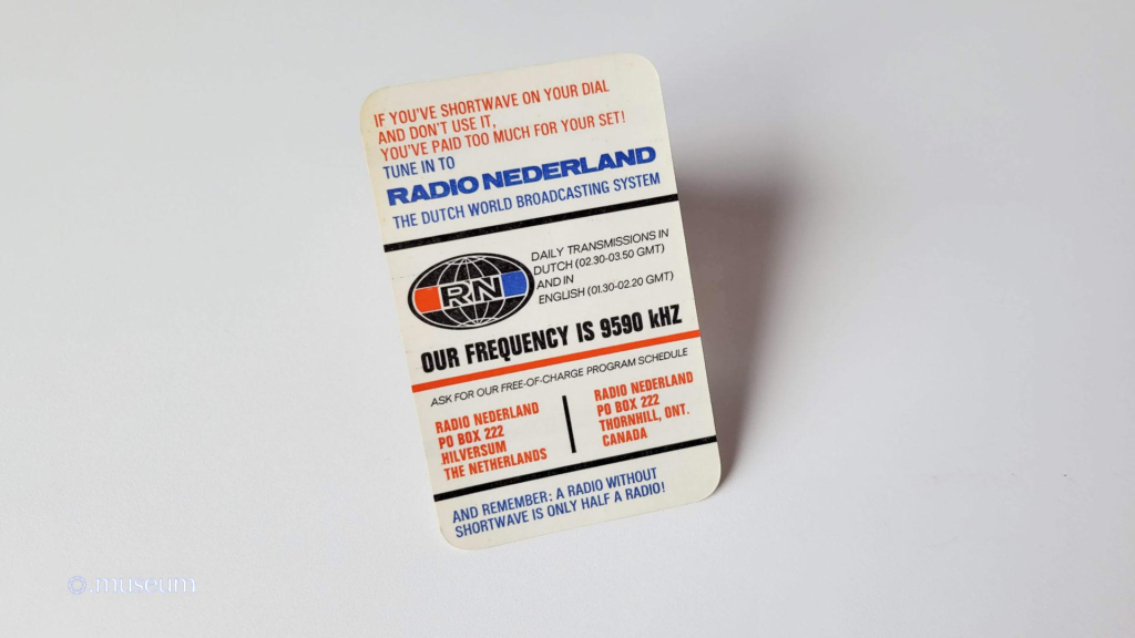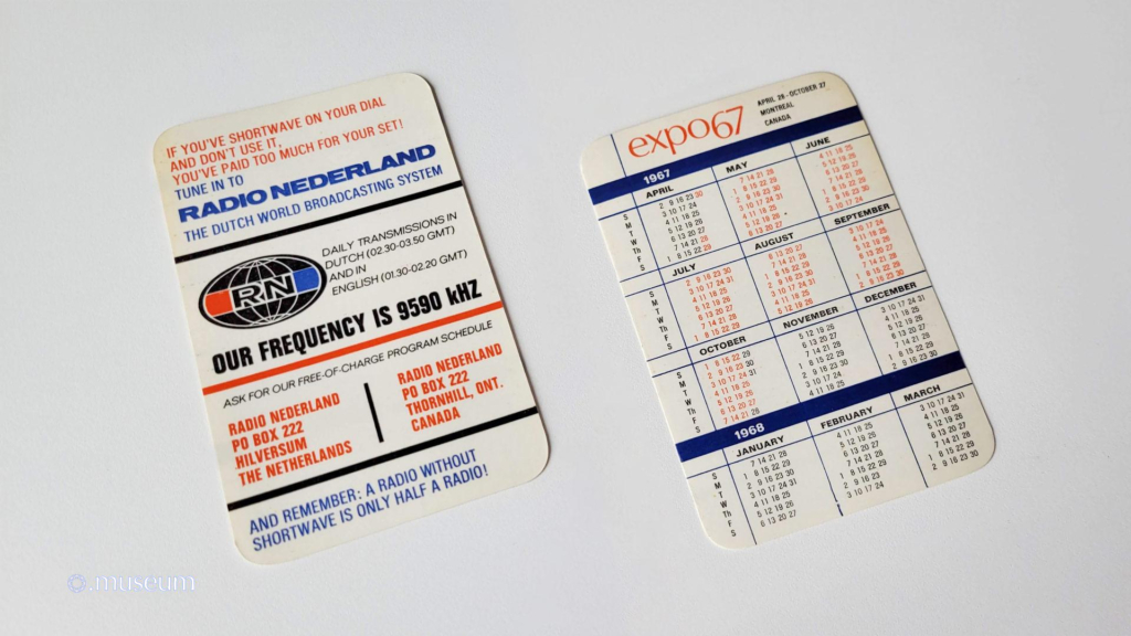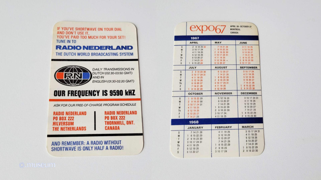 Annual calendar in the form of a memo card of Radio Nederland with its frequency. “If You’ve Shortwave on Your Dial and Don’t Use It, You’ve Paid Too Much for Your Set! Tune in to Radio Nederland the Dutch World Broadcasting System. Daily Transmissions in Dutch (02.30-03.50 GMT) and in English (01.30-02.20 GMT). Our frequency is 9590 kHz”