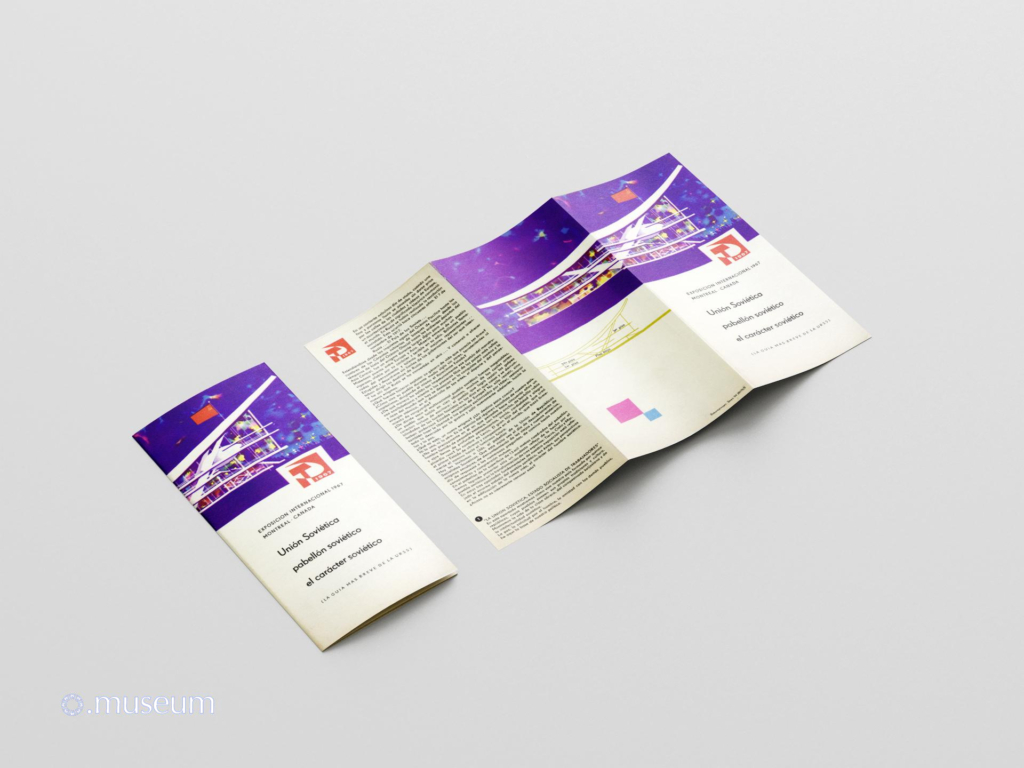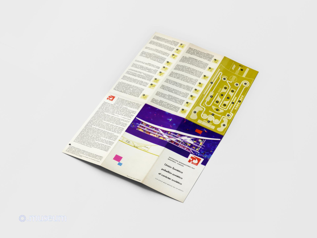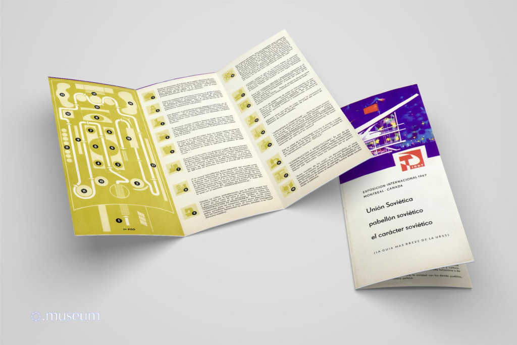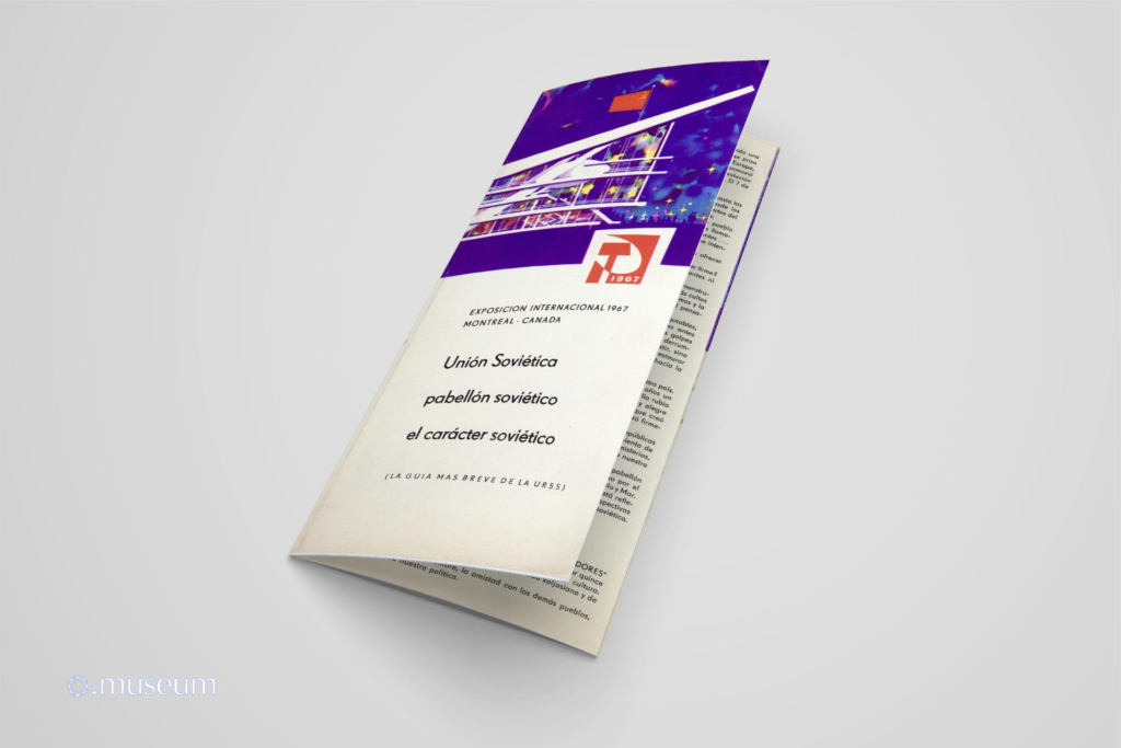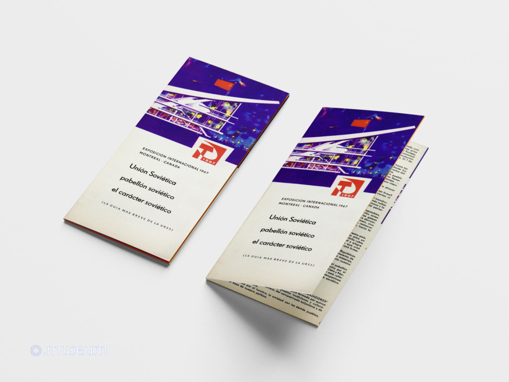 This brochure is one of the most widely distributed documents to the public during Expo 67. It is easily found for resale on online auction sites. It is very graphic and colorful, drawing inspiration from a space exploration theme. It describes the Soviet pavilion, with a map of the different levels. It comes in various versions (matte paper with a red hammer and sickle logo, glossy paper with a similar but silver logo) and in at least 6 known languages: French, English, and less commonly or even very rare in German, Spanish, Russian, and Ukrainian. “The Soviet Union, the Soviet Pavilion, the Soviet Character. An event of epochal significance shook the world one ordinary, dreary autumn day, when a fine drizzle sprayed the streets of European towns and villages. A socialist revolution broke out in Russia. This happened fifty years ago, on November 7th, 1917. The Rus… Russia … the Land of the Soviets…”