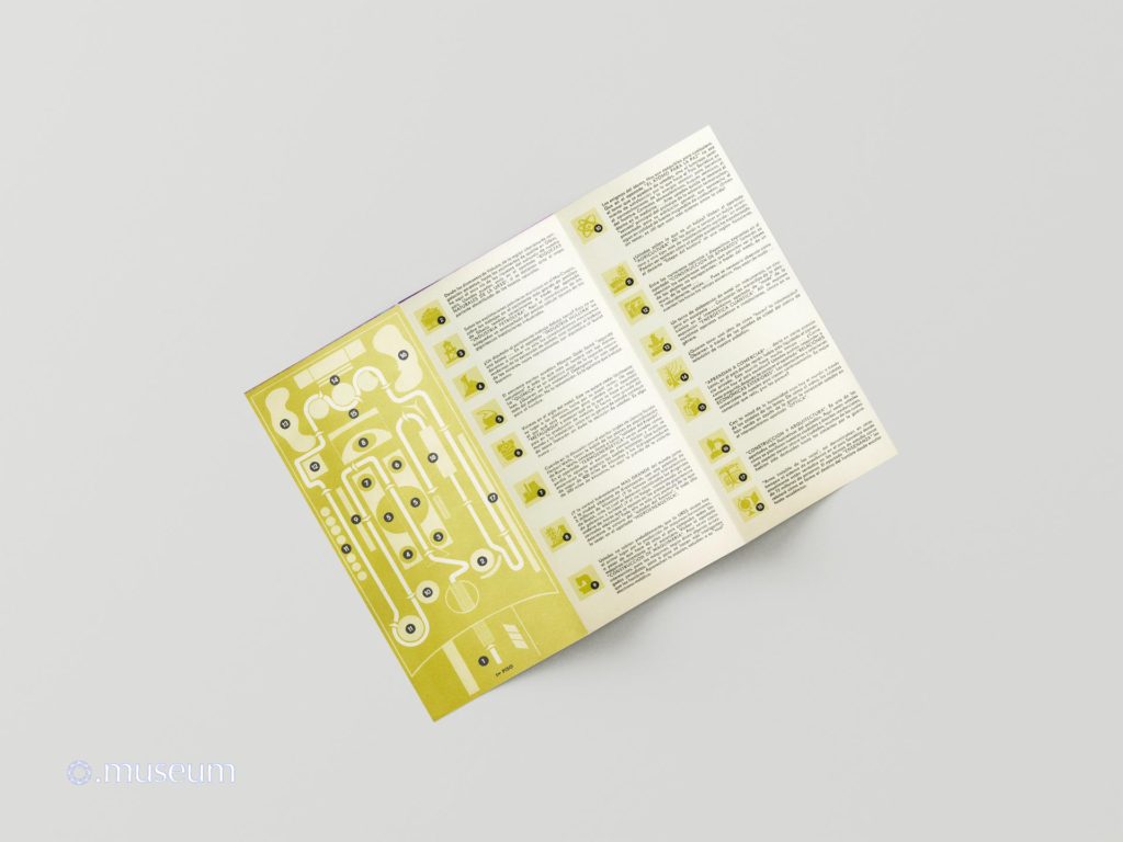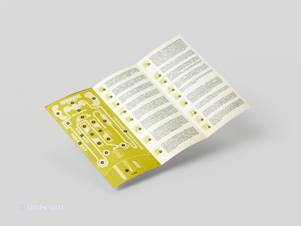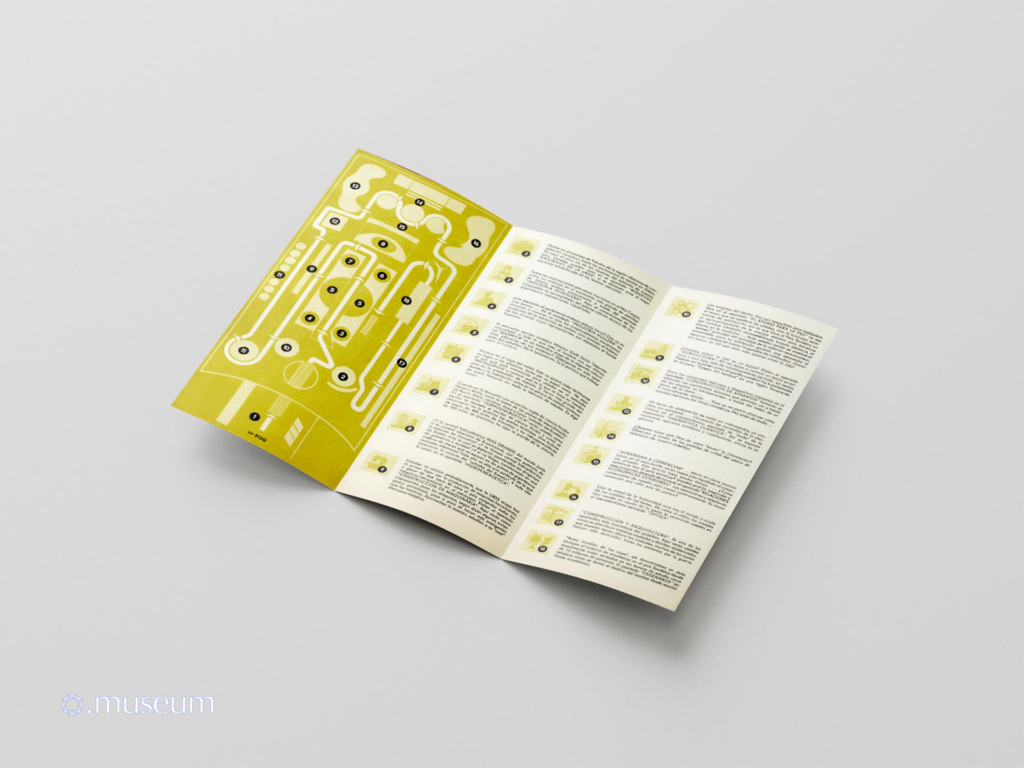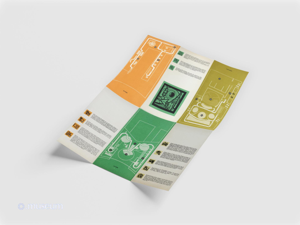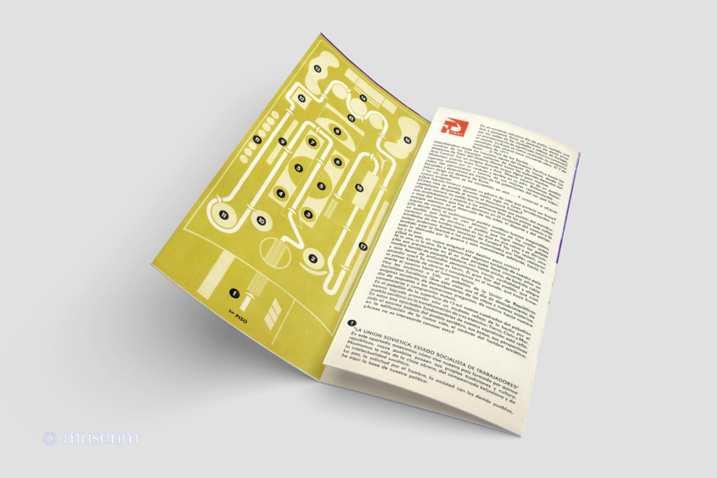 This brochure is one of the most widely distributed documents to the public during Expo 67. It is easily found for resale on online auction sites. It is very graphic and colorful, drawing inspiration from a space exploration theme. It describes the Soviet pavilion, with a map of the different levels. It comes in various versions (matte paper with a red hammer and sickle logo, glossy paper with a similar but silver logo) and in at least 6 known languages: French, English, and less commonly or even very rare in German, Spanish, Russian, and Ukrainian. “The Soviet Union, the Soviet Pavilion, the Soviet Character. An event of epochal significance shook the world one ordinary, dreary autumn day, when a fine drizzle sprayed the streets of European towns and villages. A socialist revolution broke out in Russia. This happened fifty years ago, on November 7th, 1917. The Rus… Russia … the Land of the Soviets…”