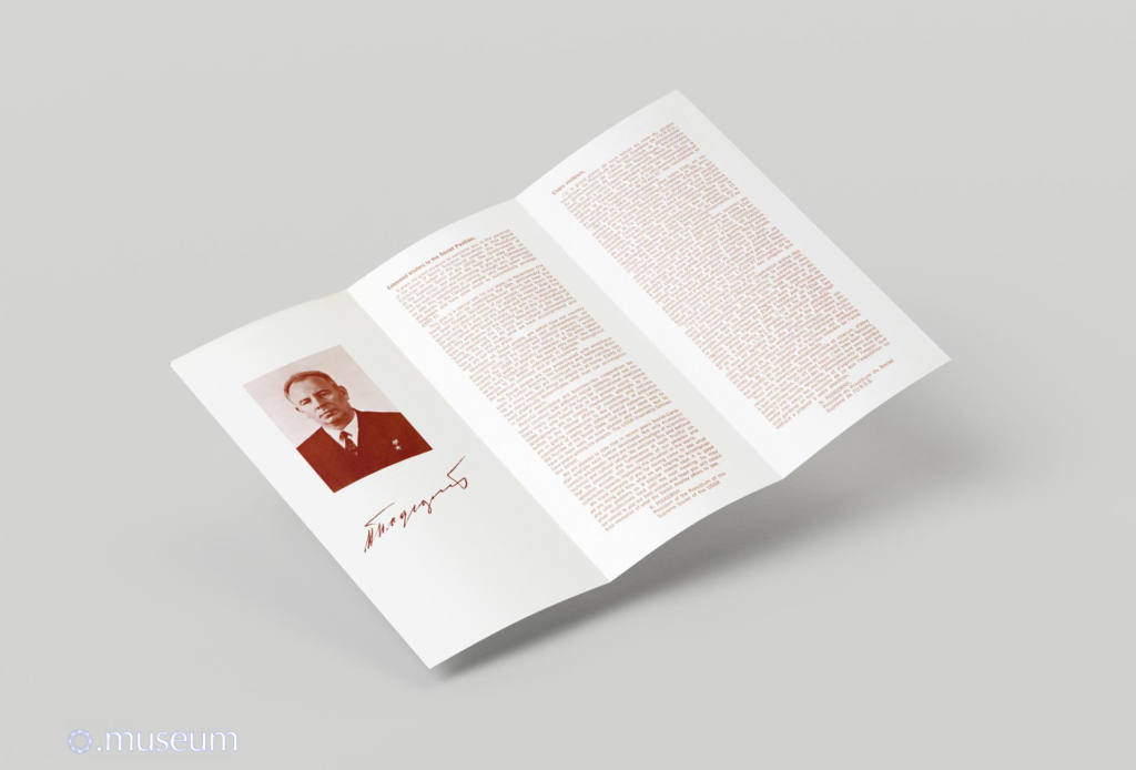 Open the document Message of Nikolaï Podgorny, President of the Presidium of the Supreme Soviet of the USSR, à for the visitors of the Soviet Pavilion. “This year is a special one for our state. In November the Soviet Union will be celebrating the 50th anniversary of the Great October Socialist Revolution which set free…