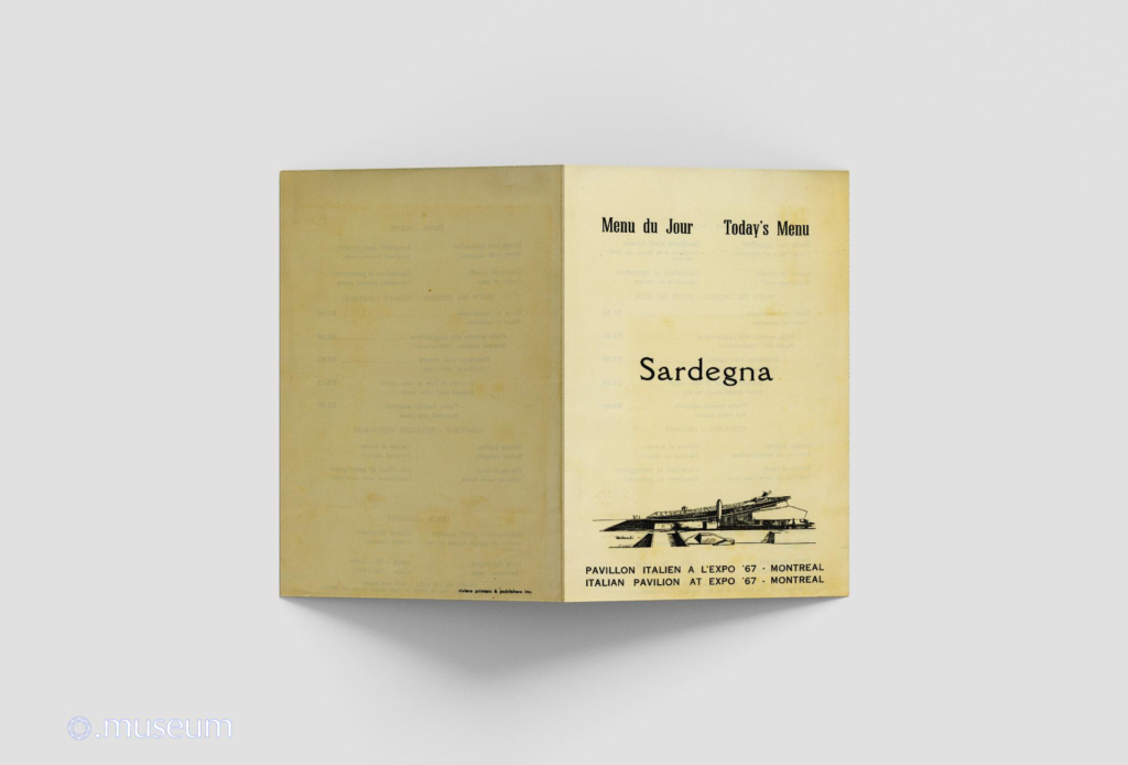Ouvrir le document Menu du restaurant du pavillon italien. Thématique sur la région de la Sardaigne. Parmi les plats sur jour : Trota in casseruola (Truite en casserole), Pollo arrosto alla cagliaritana (Poulet rôti « cagliaritana »), Ossobuco con risotto (« Ossobuco » avec riz). Brasato di bue al vino rosso (Bœuf braisé sauce au vin) et Piatto freddo assortito…